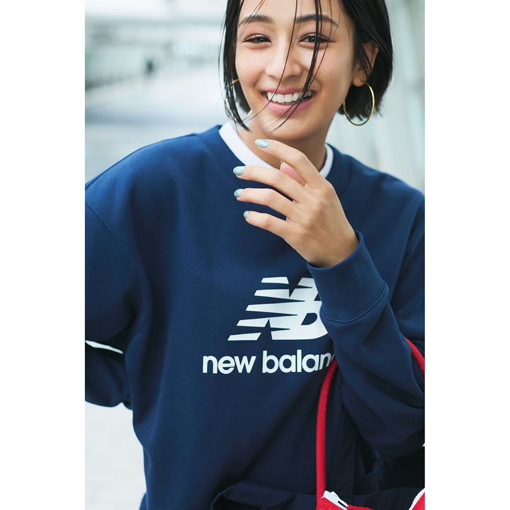 レトロな印象のブランドロゴ主張、が今またおしゃれ! 白Tを重ねると“あえて着ました”感が出て小粋にまとまる。スウェットトップス¥7,920、スニーカー¥11,990(ともにニューバランス/ニューバランスジャパンお客様相談室) 中に着たTシャツ※メンズ¥23,100(オールド イングランド/オールド イングランド銀座店)パンツ¥22,000(フィーニー) ピアス¥19,800(マリア ブラック/マリア ブラック 表参道店) 赤バッグ¥18,480(コキヨ/アダム エ ロペ) トートバッグ¥14,300(サンディニスタ/トゥー・ステップ) ソックス¥3,300(シー/エスストア)