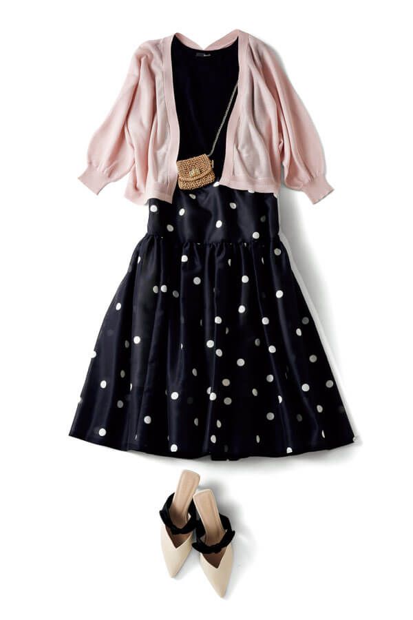 大粒ドットが目を引くモノトーンルックには、抜け感のいいシアーカーデがベストマッチ!