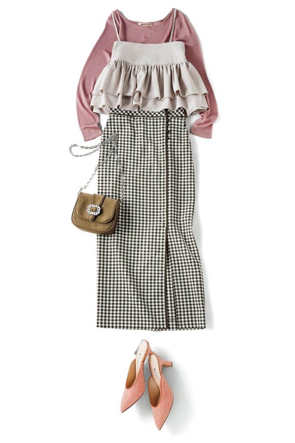 ニット¥12,100/アプワイザー・リッシェ キャミソール¥7,920/NATURAL BEAUTY BASIC スカート¥8,250/RESEXXY バッグ¥6,490/カシュカシュ(アンビリオン) 靴¥16,500/ダイアナ(ダイアナ 銀座本店)