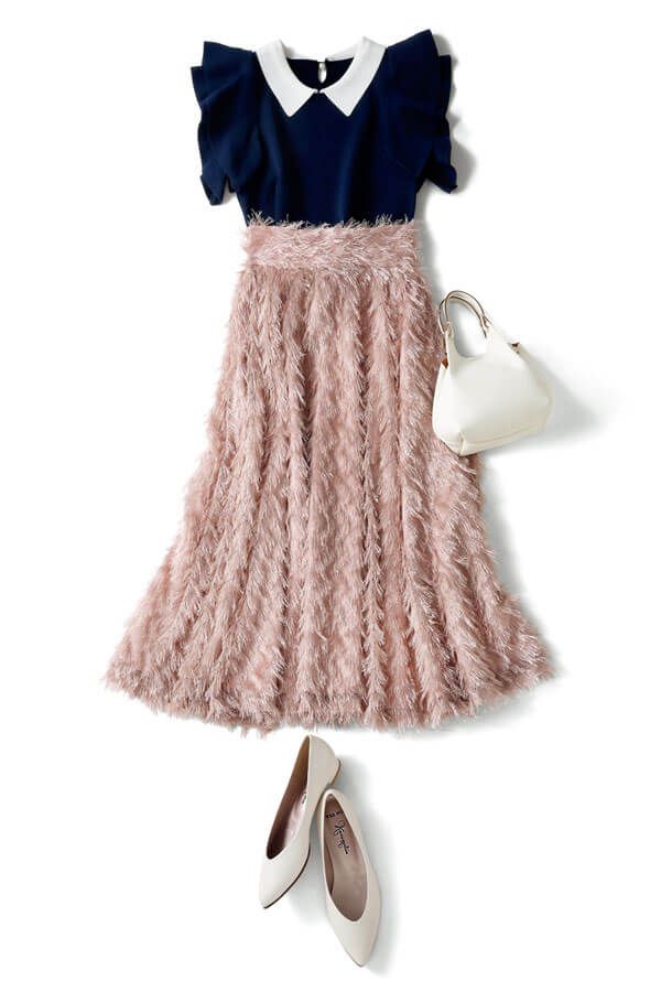 ピンクスカートの存在を高めるシャギー素材の華やかさ♪