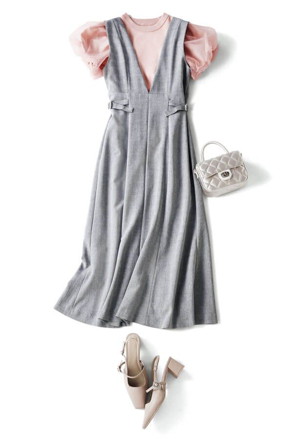 部分チュール袖が上半身に抜け感を与える計算。マルチに活躍するジャンスカで小粋にレイヤード。