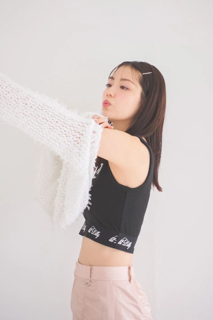 黒ロゴタンクトップ 5,500円/lilLilly(lilLilly TOKYO) 白ローゲージショート丈ニット 6,930円/Alley by w closet(WEARS INC.) ピンクカーゴスカート 13,200円/rienda(バロックジャパンリミテッド) ヘアピン/スタイリスト私物