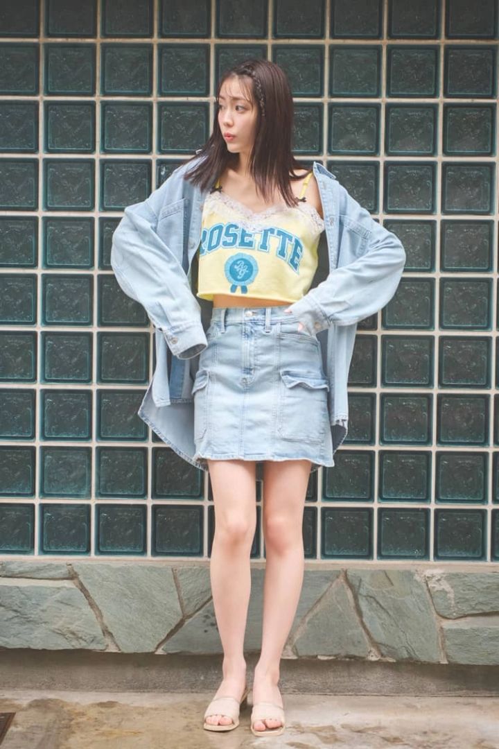 ビッグデニムシャツ 4,499円/H&M デニムカーゴミニスカート 6,990円/Gap イエローレースビステエ 5,940円/Alley by w closet(WEARS INC.) サンダル 2,530円/神戸レタス