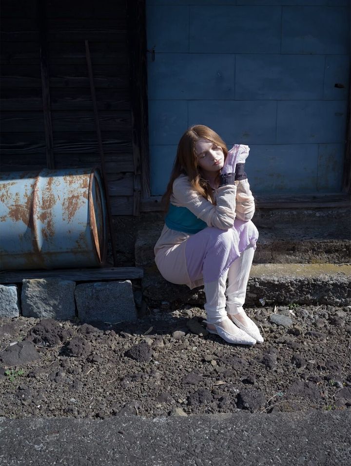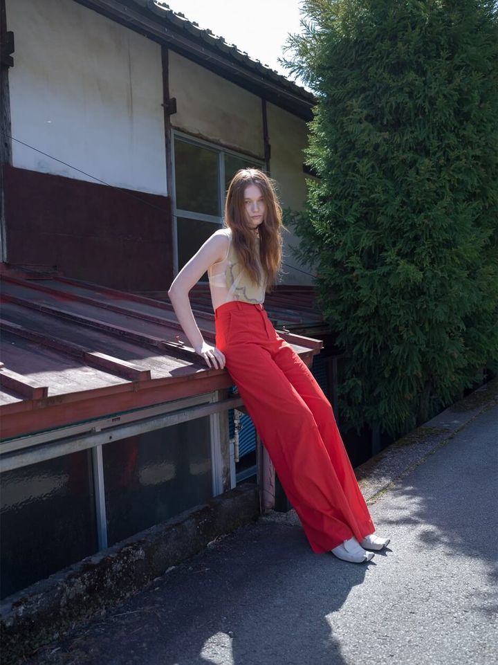 knit top by AURALEE, top, inner top, dress and trousers by ISSEY MIYAKE, shoes by MAME KUROGOUCHI