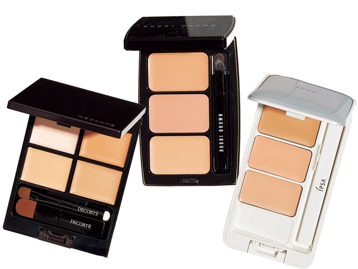左から:ハイライトカラー、オレンジ系、トーン違いのベージュが2 色揃って万能。アレコレ隠したい人に。トーンパーフェクティングパレット 01 ¥4,950(コスメデコルテ)油分を多く含んだなめらかな質感は、広範囲に広がる肝斑などにベストマッチ。スキン タッチアップパレットフェアトゥライト 2 ¥6,380 ※ 4/5 発売(ボビイ ブラウン)やや明るいトーンのベージュの3 色パレット。目まわりに集中する悩みに効果を発揮。クリエイティブコンシーラーe SPF25・ PA+++ ¥3,850(イプサ)