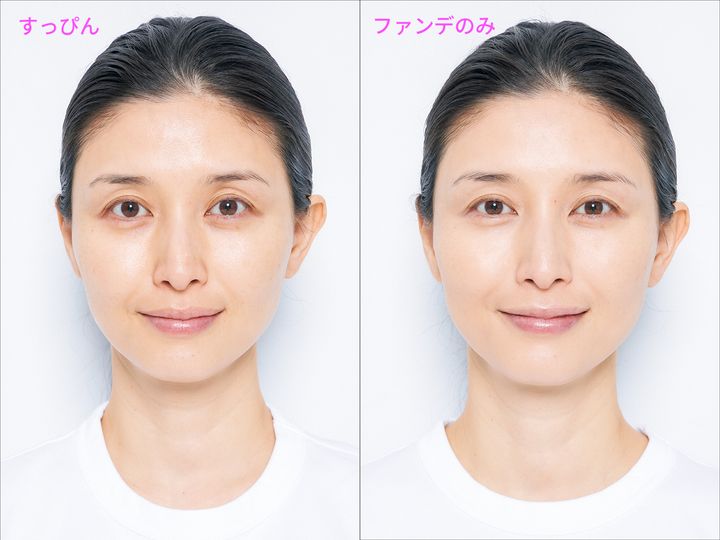 シミや影感が少ないマナミさんでも、すっぴんだとやや色ムラが。ファンデだけでもある程度は整うものの、近づくと目や口周り、頰のくすみ感が少し目立つ印象。