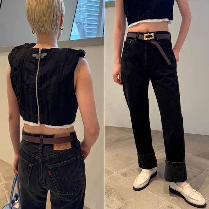 「ピリングスのトップスはザニームの別注アイテムです。大人な肌見せができるショートトップスは一枚で潔くスタイリングしてみてほしいアイテム。前後で着用でき、後ろのチャック部分には蝶々のチャーム。遊び心がある可愛いポイントです♡」トップス¥41,800(ピリングス)、デニム¥24,200(リーバイス®/共にSELECT by BAYCREW'S THENIME)