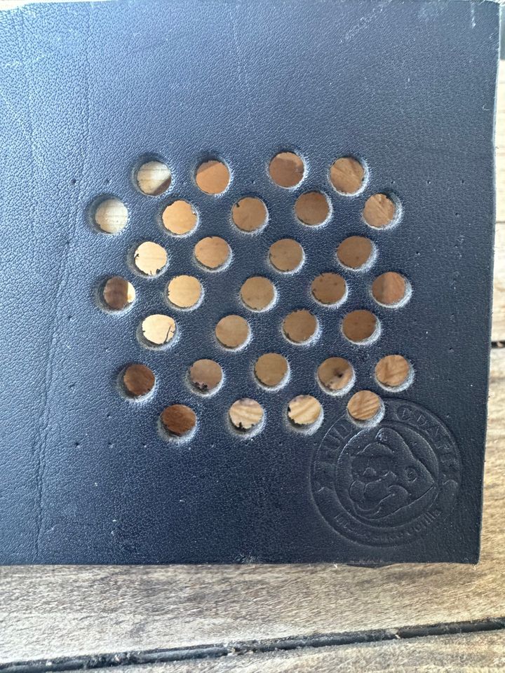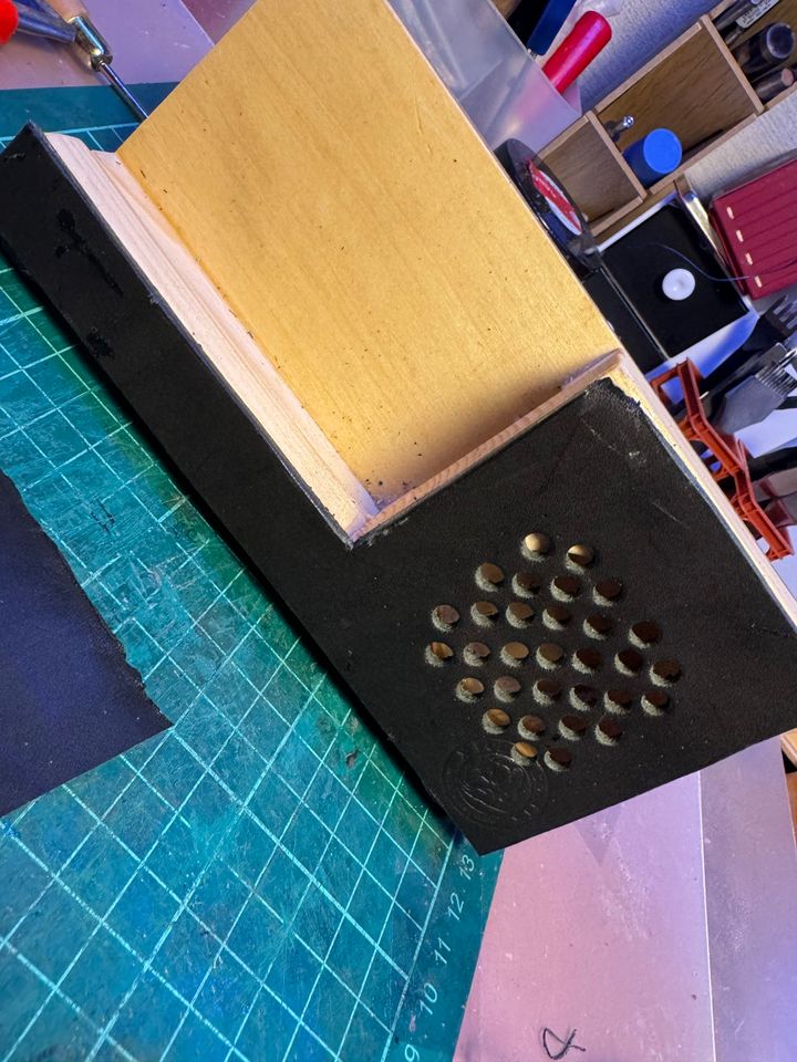 せっかくなので、これまたハギレの革を貼り付けました。スピーカーによくありそうな穴を開けて、刻印を入れてみました。これで音が柔らかくなる気がします。(個人の感想です)