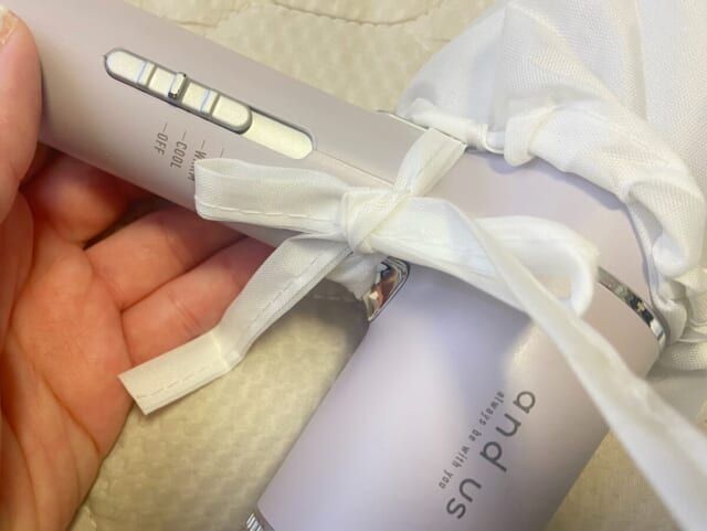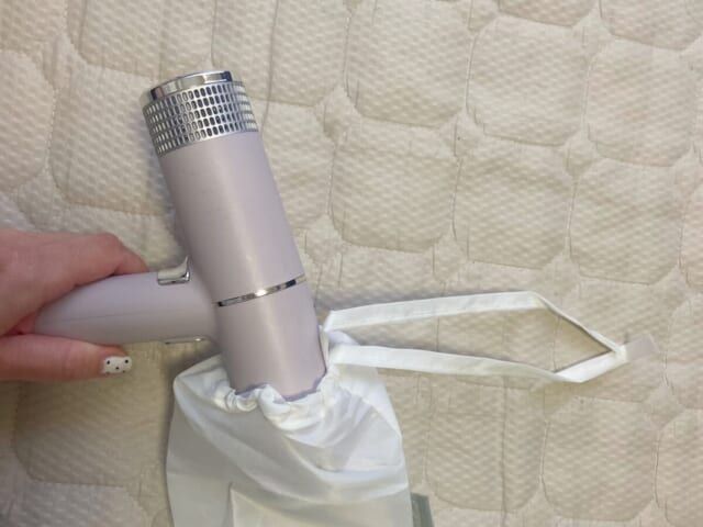 衣類乾燥袋の口の部分にはドライヤーを固定する紐があるので、ドライヤーの持ち手に紐を結べばセット完了です。細めのドライヤーを使用しましたが、問題なくドライヤーをセットできました。