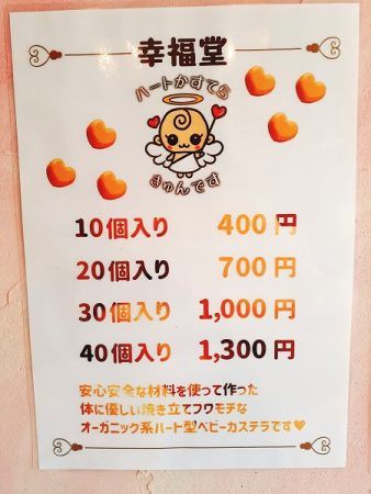 4月26日で1周年を迎えられた【幸福堂】さんは、オーガニック系のハート型ベビーカステラ屋さん。トレードマークの幸せを呼ぶ天使、きゅんチャンが目印のお店です。
