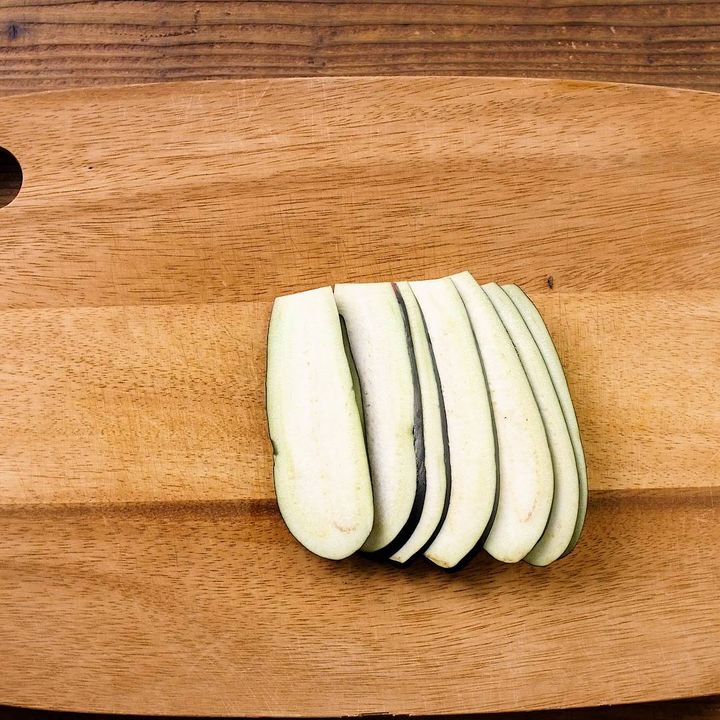1: なすはヘタを取って2〜3mm幅の薄切りにします。塩を振って少し置き、しんなりとしたらキッチンペーパーで水気を拭き取ります。