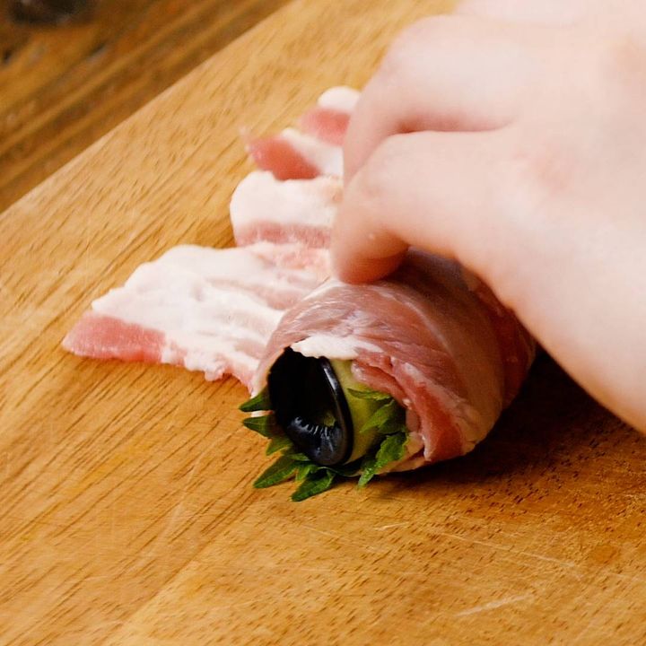 2: 豚バラ肉を広げて味付塩こしょうをふり、大葉、①のなすを重ねてくるくると巻きます。