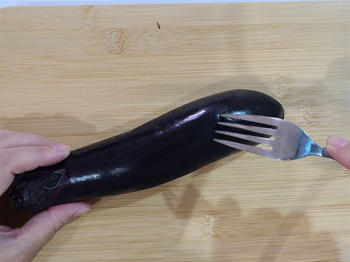 1. なすに味をしみこませるため、フォークで穴をあけていきます。
