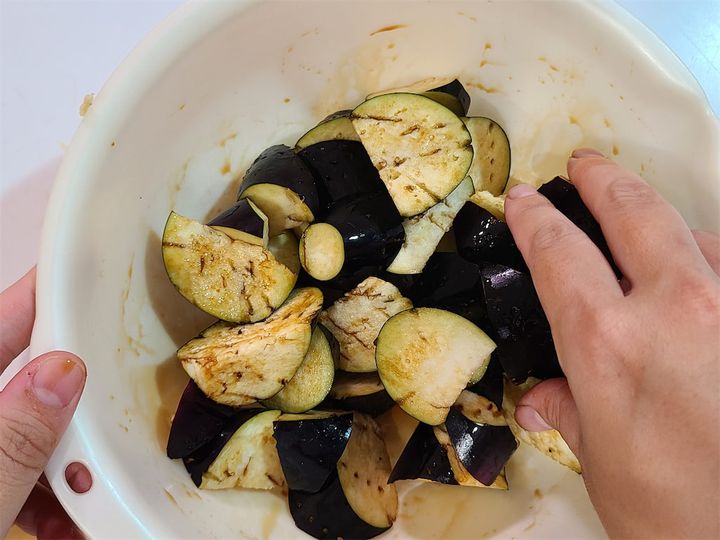 3. 切ったなすをボウルに入れ、しょうゆを回しかけ、もみ込みます。