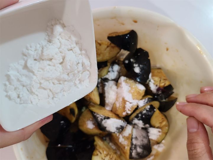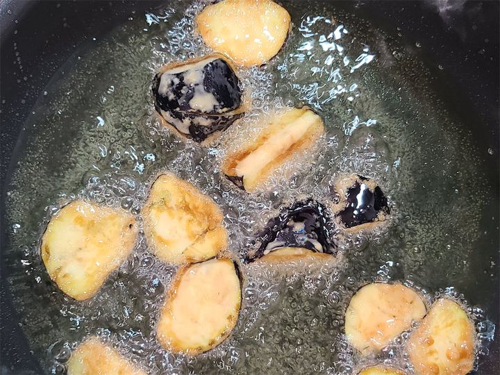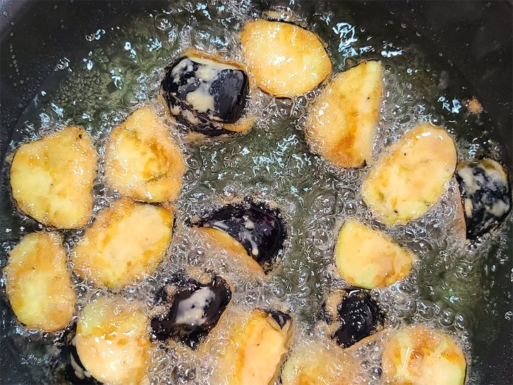 片栗粉でコーティングしているので、なすが油を吸いすぎるのを防いでくれていて、見た目より油っこくありません!