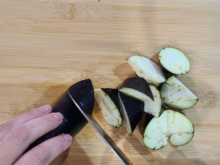 なすをフライパンに入れたら、なるべく触らないことがポイントです。