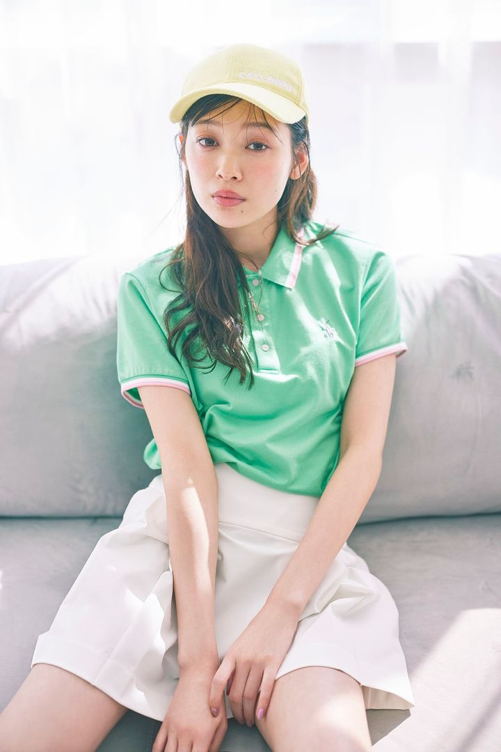 クリアな白ミニと合わせることで、グリーンポロの爽やかさが3割増し。さりげに入ったいちごミルクカラーの切り替えが、お茶目なアクセントに。パキっと高発色なイエローキャップも夏っぽくてGOOD。