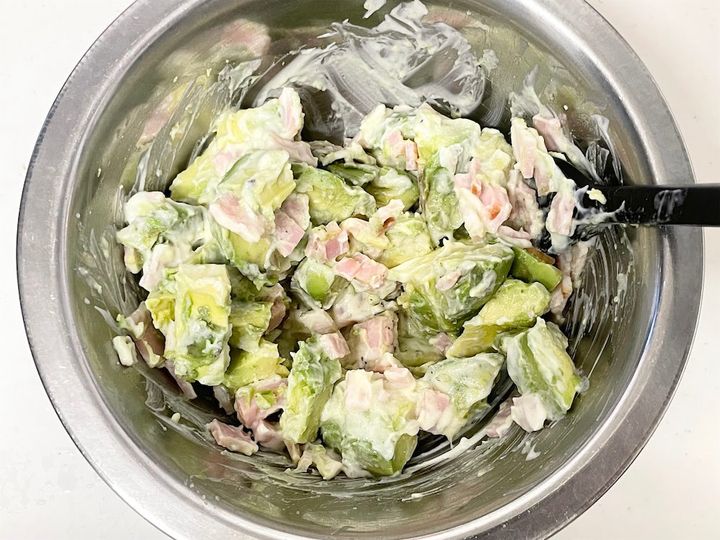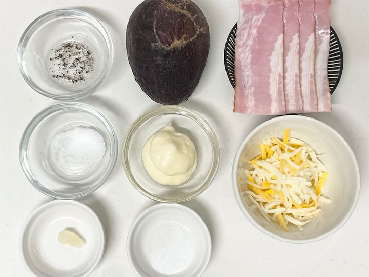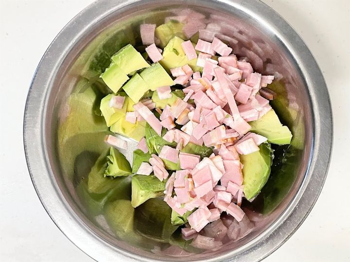 1. アボカドとベーコンを細かく切り、ボウルに入れます。