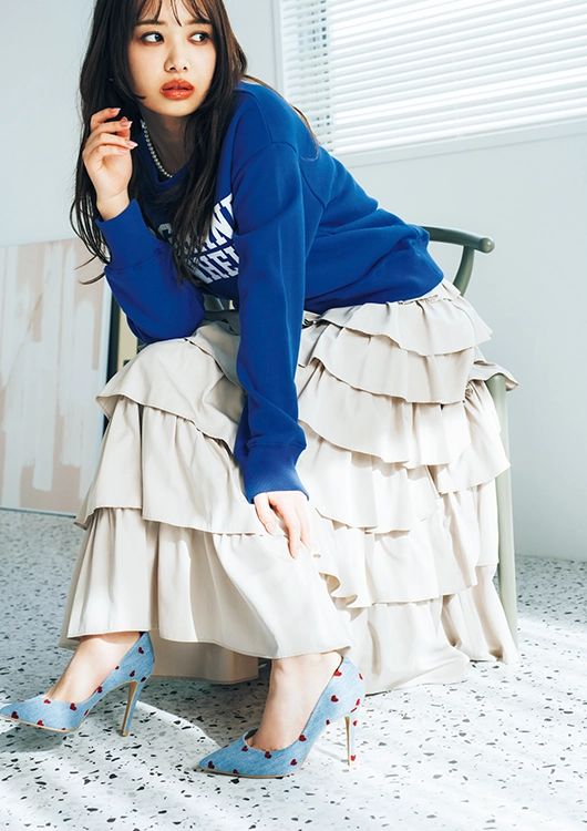ハート柄デニムパンプス¥17,600/ダイアナ(ダイアナ 銀座本店) スウェット¥15,400/アルページュストーリー フリルスカート¥34,100/ダブルスタンダードクロージング(フィルム) イヤリング¥2,530、ネックレス¥5,500/ともにアネモネ(サンポークリエイト)