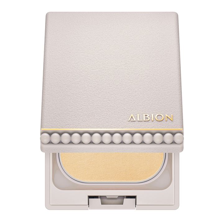 「美容液成分配合のパウダリー。重ねても厚塗りにならないのでリタッチに最適。ブラシでくるくる重ねて乾燥毛穴をカバー」全6色。SPF 15・PA+++ ¥5,500〈セット価格〉(アルビオン)