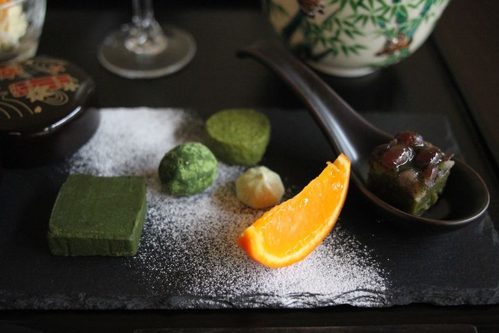 プレートには抹茶のテリーヌに、ほろほろクッキー、チーズクッキー、塩メレンゲといった抹茶の焼き菓子3種など、ひと口サイズの抹茶スイーツが品よく並んでいます。最後までおいしくいただけるようにと、箸休めに塩味のお菓子や、さっぱりとしたオレンジが添えられているのも◎