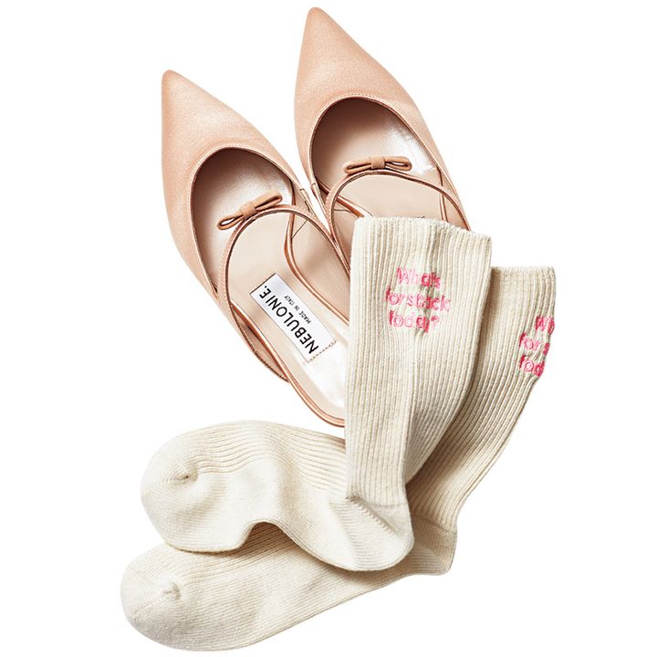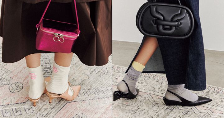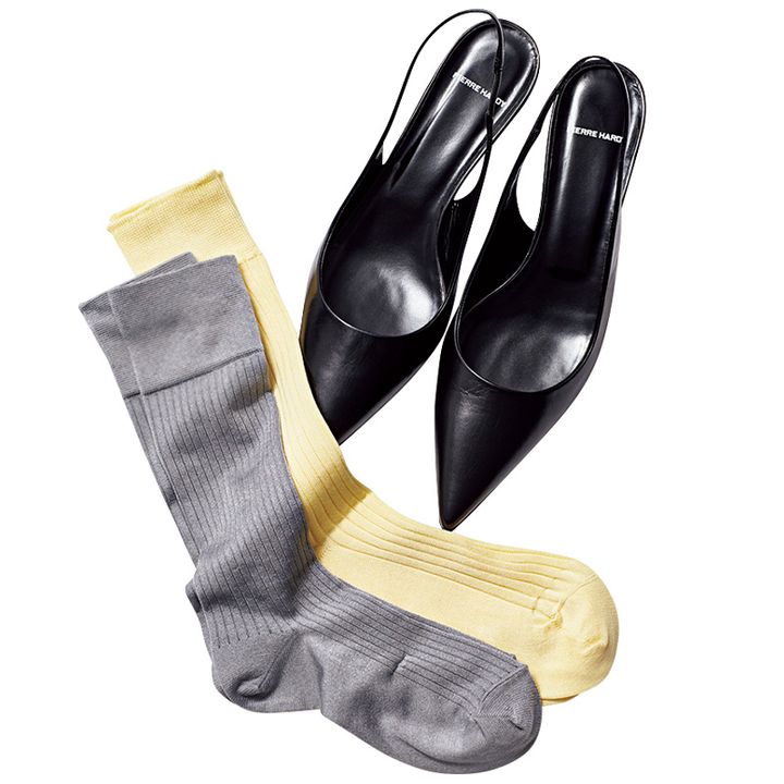 今季話題の薄手ソックス“2枚重ね”テク。優しいイエロー×グレーもシャープな黒フラットシューズで引き締めて。