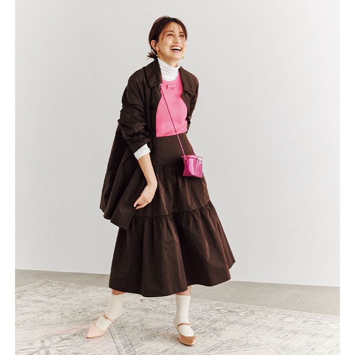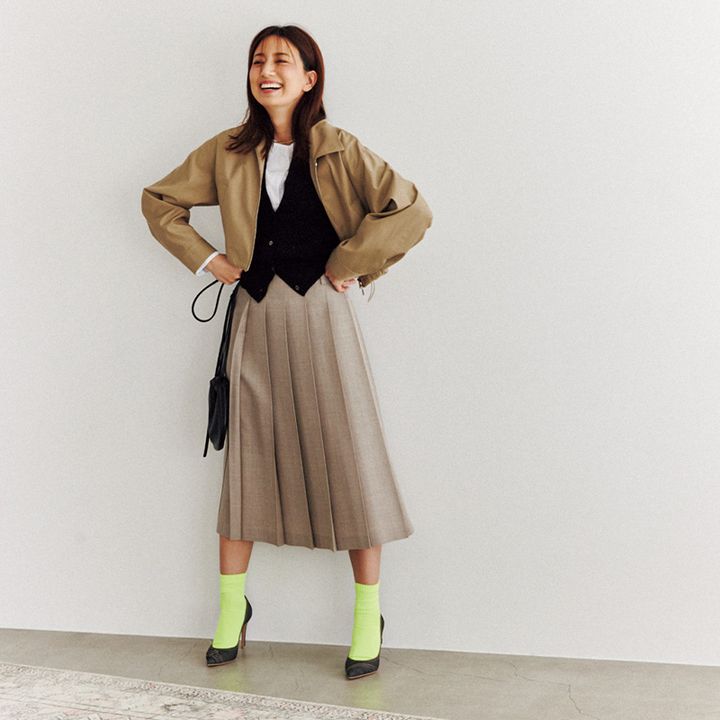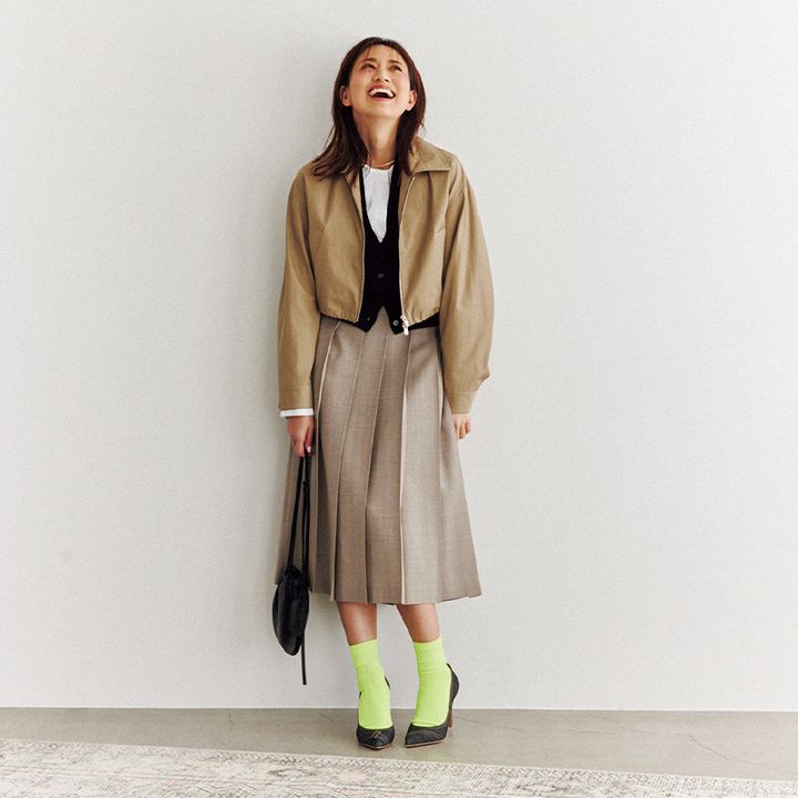ソックス¥1,320(タビオ/Tabio)パンプス¥17,600(ダイアナ/ダイアナ 銀座本店)アウター¥71,500(パッド/エストネーショングラン フロント大阪店)シャツ¥49,500(ファクソ ジャクマ[アダム エ ロペ]/ジュンカスタマーセンター)ニットベスト¥36,300(コズ マニュファクチャード バイ ラッピンノット/ウメダニット)スカート¥47,300(シー/エスストア)バッグ¥63,800(ハイク/ボウルズ)ネックレス¥9,350(デミルクス ビームス/デミルクス ビームス 新宿)