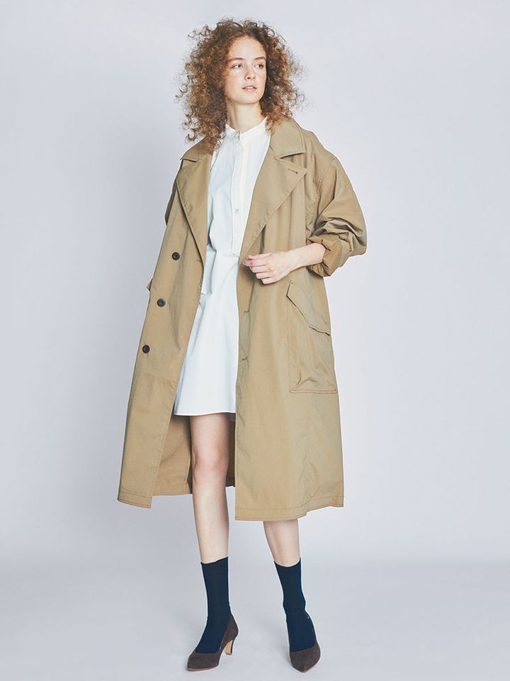 1枚で着られるチュニック丈は、ほかは硬派なアイテムでまとめると、ドレスがわりにオケージョンに通用する仕上がりに。シャツならではのスマートさがあれば、素足を出しても上品。セミダブル仕立てのトレンチライクなコートをはおり、着心地は軽やかにクラシカルなムードをあと押し。