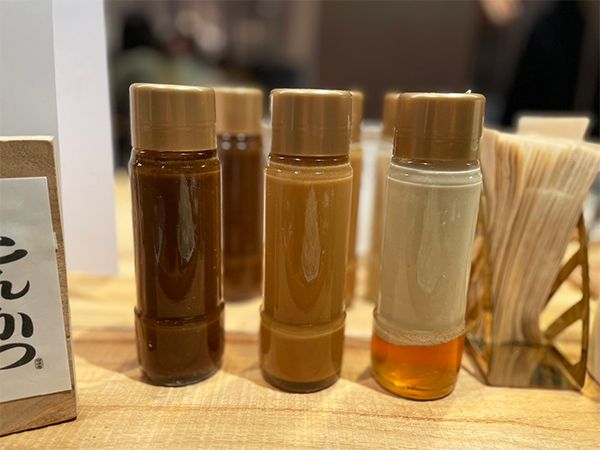 テーブルの上に置かれている、(左から)自家製のウスターソース、ごまだれ、ドレッシング。 とんかつがやってくるのを気長に待ちながら、先に出てきた千切りキャベツに自家製ドレッシングをかけていただきましょう~