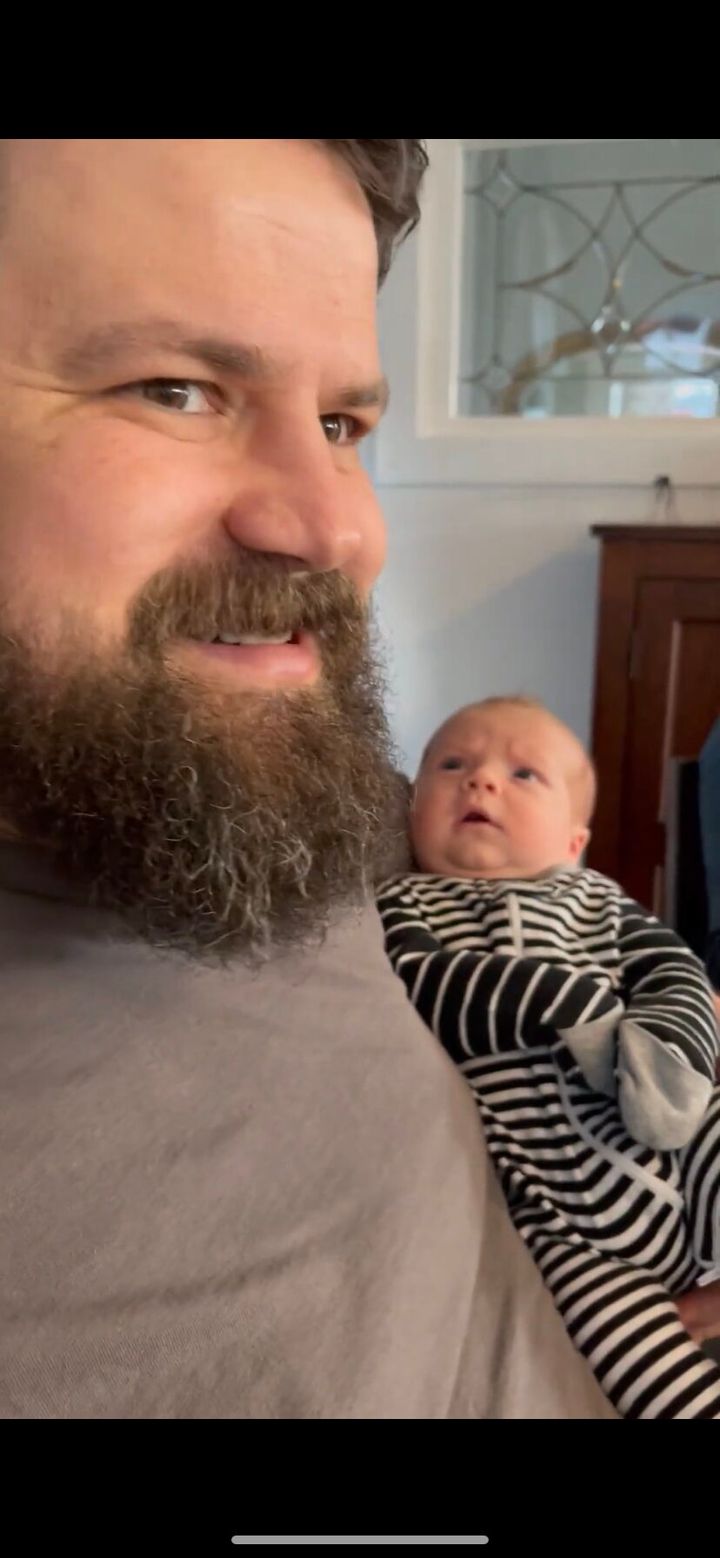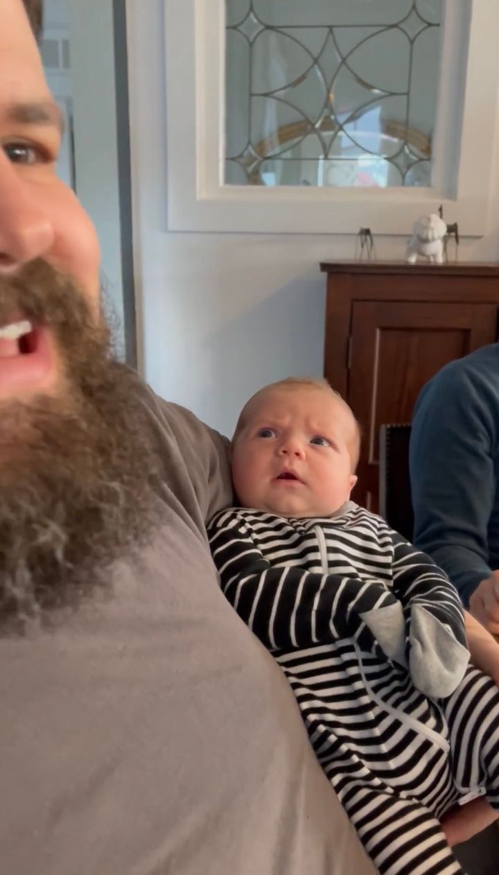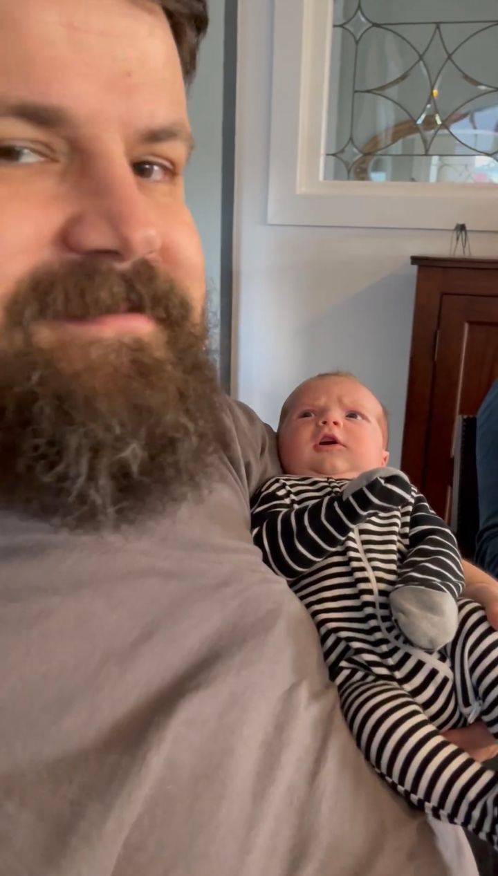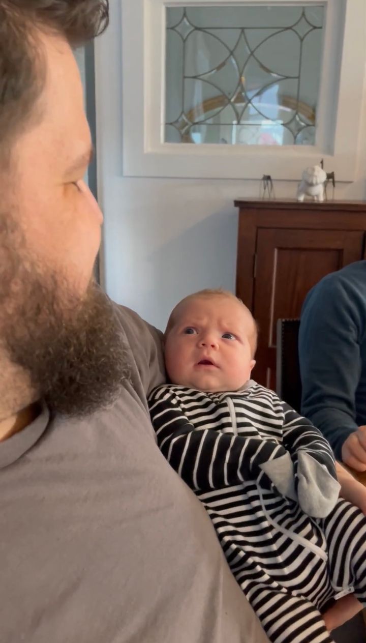 3. 眉をひそめながら男性にだっこされる赤ちゃん。初めて見た立派なおひげにビックリ??【アメリカ・動画】