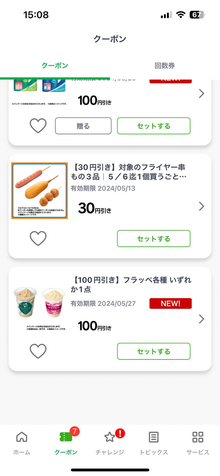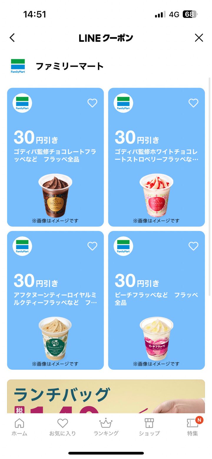 人気のショップより、ファミリーマートを選択すると、今すぐ使えるフラッペの30円引クーポンが表示されるので、是非使ってみてください!