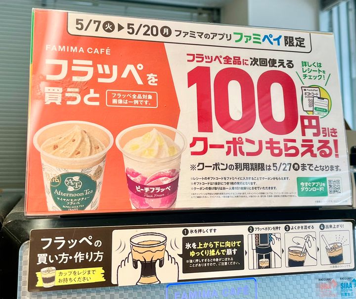 フラッペを買うとレシートに、フラッペ全品に使える100円引きファミペイクーポンが