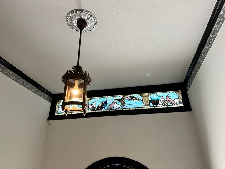 「鳩山」という名前にちなみ、ステンドグラスのほとんどに鳩のモチーフがほどこされていました。