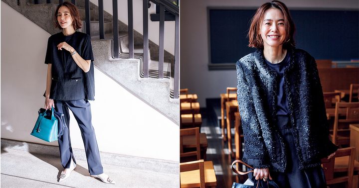 3. 学校ママは“Tシャツ”軸で黒紺コーデ!ジャケット&ジレできちんと見え