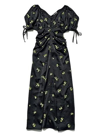 黒バタフライスリーブドレスワンピース/MOUSSY(バロックジャパンリミテッド) 光を帯びた黒のナイロン素材をバックにすれば、小花柄の糖度もひかえめに。広めの間隔でささいな白+グリーンが散らばることで、黒の緊張感も落ち着く相乗効果もアリ。