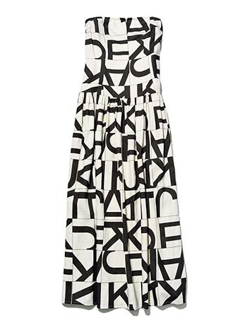 ベアワンピース/ジャッキー(ジャック・オブ・オール・トレーズ プレスルーム) 迫力のある総柄デザインも白多めのモノトーンなら手にとれる。重ね着しやすいベアトップだから、羽織りやロンTを重ねてスカート風に着るアレンジも。