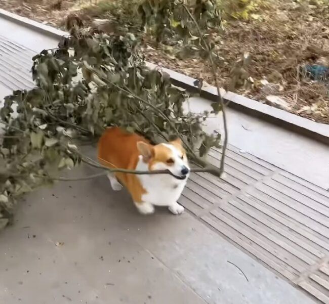 大きすぎる枝を発見! 持ち帰りたいコーギーさん。