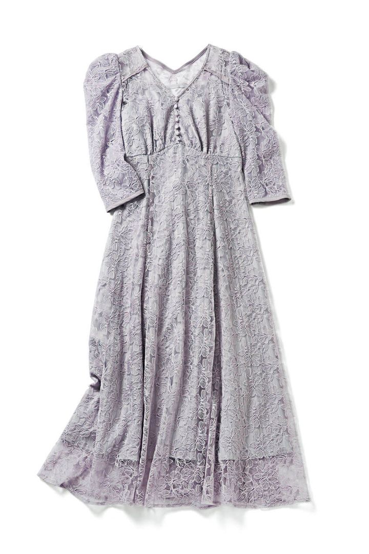 ロマンティックな総レースワンピも、くすみトーンならエレガントで落ち着いた印象。さらに、ふわっとふくらむパフスリーブも女性らしさ満点♡