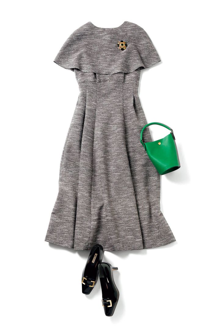 ケープワンピース¥16,500/Noëla ブローチ¥44,000/アビステ バッグ¥57,200/ロンシャン(ロンシャン・ジャパン) 靴¥18,150/ダイアナ(ダイアナ 銀座本店)