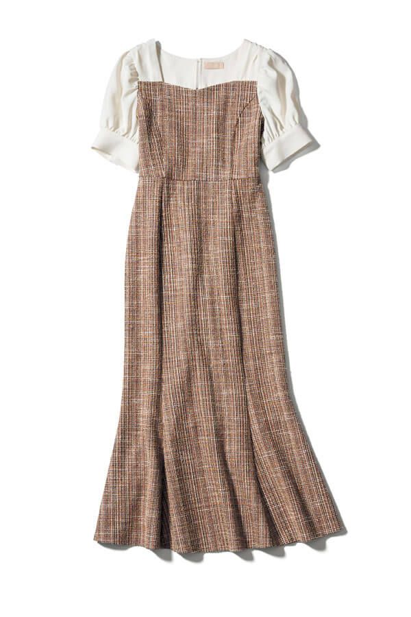 ベージュの地にさりげなく浮かべた千鳥格子がリッチシックなドレス。ウエスト位置高めに設計されたくびれラインやマーメイドラインが女性らしいカービーラインを形成。