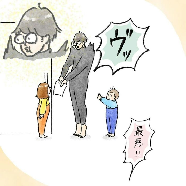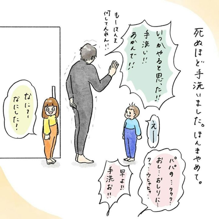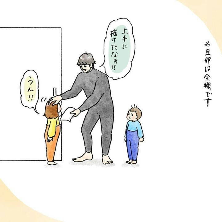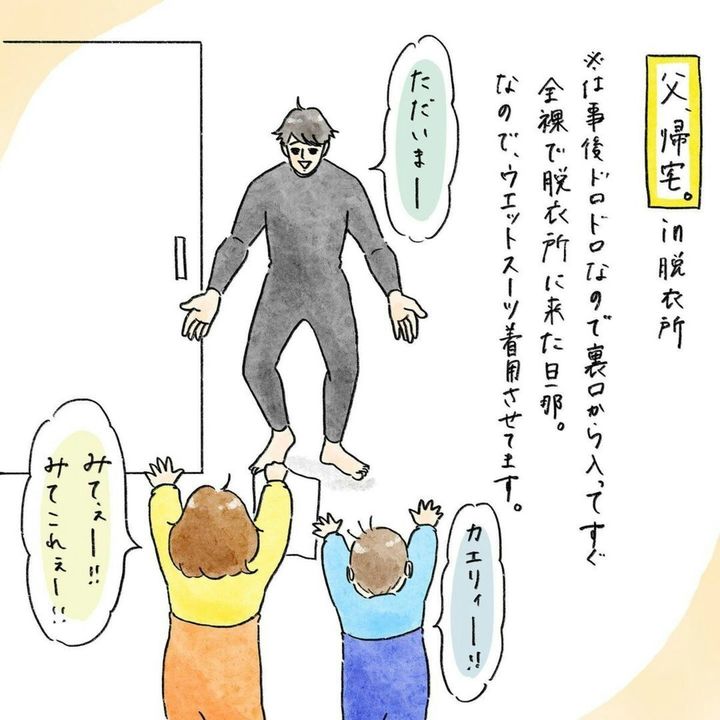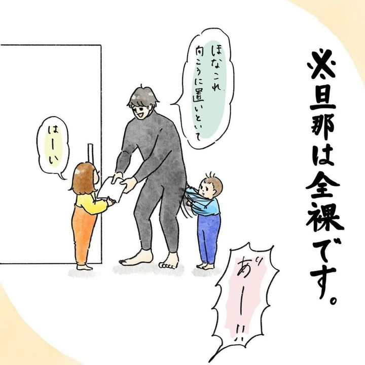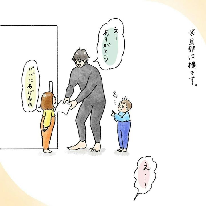 nao(@n5555on)さん・夫は仕事柄服が汚れてしまうため、家に帰るとすぐに全裸になるそうです。そんな姿でもお構いなしに子どもたちはパパのところへ駆け寄ります。そしてパパの背後に回ったのですが…?