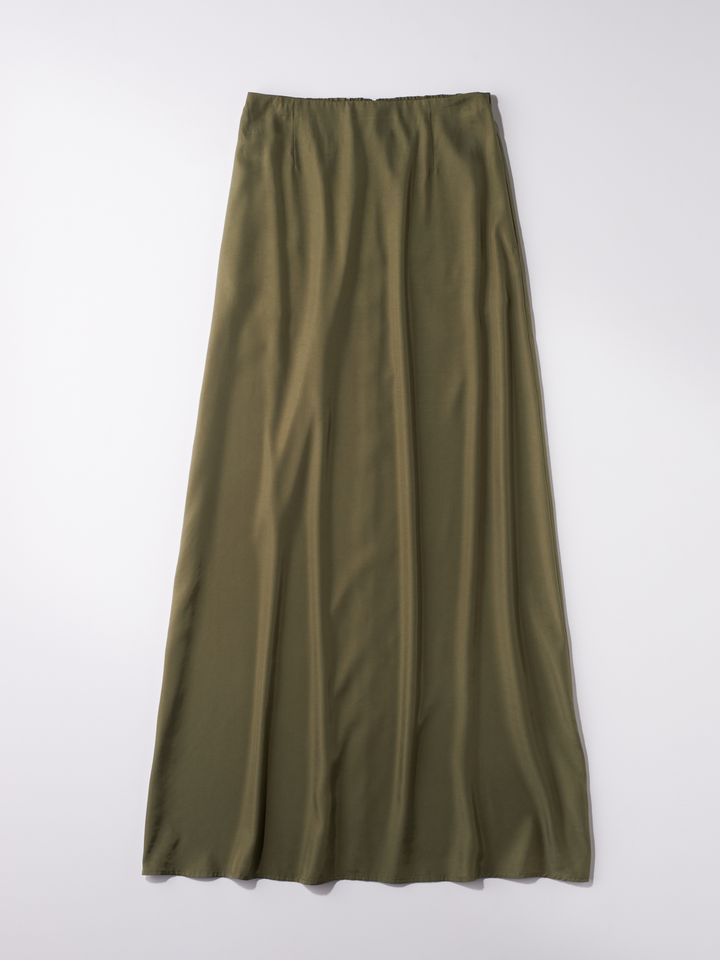 サテンの艶ととろんと落ち感のある素材が色っぽく、きれいめカットソー、夏になればTシャツやキャミソール合わせでトップスを選ばず長く使えて便利。バッグがゴムなので、きれいめなのに動きやすいのもうれしいです。暑い時期はロングスカートに手が伸びなくなりがちですが、これは接触冷感機能付き、手洗い可能で家でも洗えるので、汗ばむ夏もどんどん着れちゃいます。スカート¥18,920(ReNAVE)