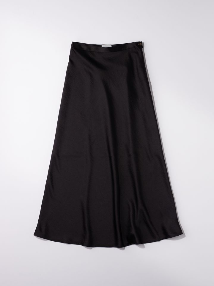 シックなツヤを持つサテン生地の、すっきりとしたラインのロングスカート。気になるボディラインを拾いにくく、甘すぎないデザインが魅力。パートナーとのディナーやママ会など少し気合いを入れたい日にぴったり。スカート¥46,200(THE NEWHOUSE/aak inc.)
