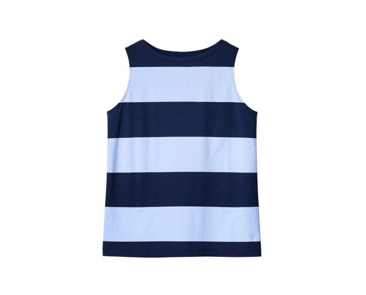 詰まりすぎないネックラインで形はシンプルに、柄は華やかなノースリーブTシャツ。ボーダーのブルーとネイビーはこのアイテムだけのカラーリング。[グラフィックTシャツ(ノースリーブ)]各1990円