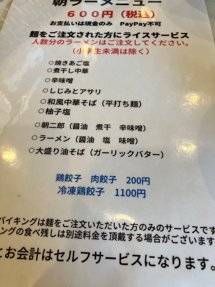 ちなみに、朝ラーの時間帯は現金のみの支払いなので、現金の用意もお忘れなく。