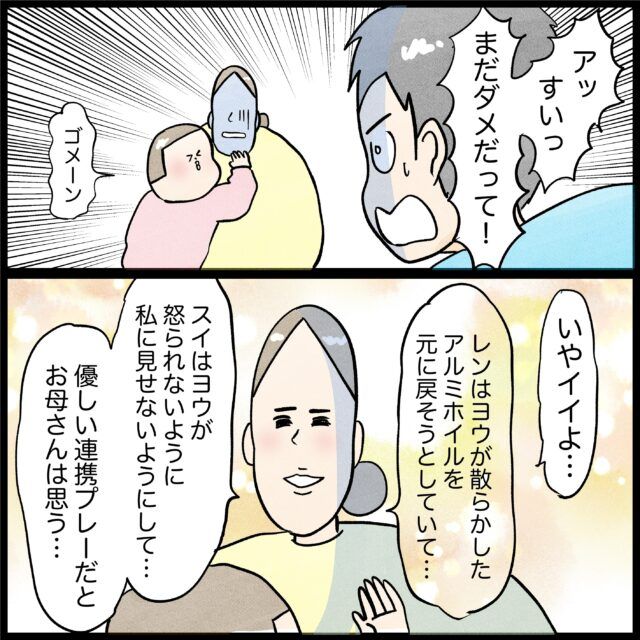 これはヤバイ!と思い目配せで妹に指示した兄、それに気づいてとっさに私の目を塞ぐ妹、そんなの気にも止めずにアルミホイルを散らかす弟・・・