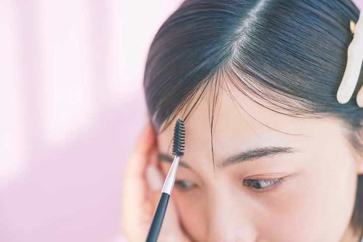 おでこを狭く見せたい人、おでこの形にあまり自信のない人にイチ押しなのがこちらの前髪アレンジ。ラフなお団子を作ったあと、おでこ周りの毛束を数束、ランダムに引っ張り出して、ふわっと浮かせるようにしながらあえて毛流れとは反対側に散らすだけ。おでこの余白をうぶバングで自然と埋めることで、小顔効果期待大、ジェル状になった髪専用のマスカラ型ブラシを使えば、細かいニュアンス出しも簡単! 整えたスタイルを自然にキープしてくれるから、風が吹いても前髪が崩れにくくて◎。