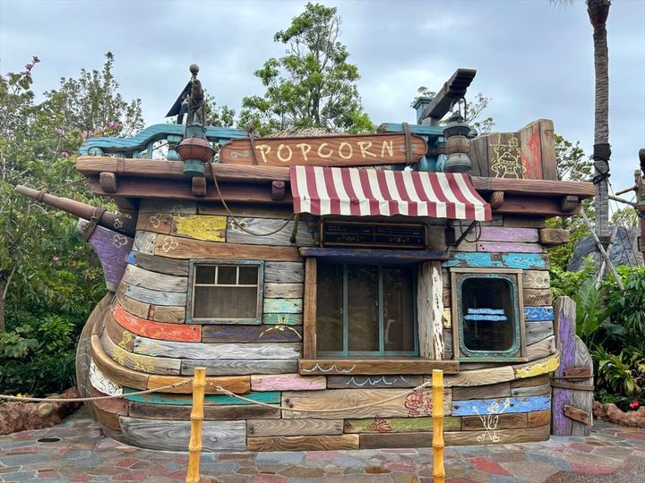 「フェアリー・ティンカーベルのビジーバギー」前にある、さまざまな色味の古い板切れを組み合わせた船のような見た目のポップコーンワゴン。こちらでは、イギリスの伝統料理であるローストビーフの味を表現したポップコーンを楽しめます。