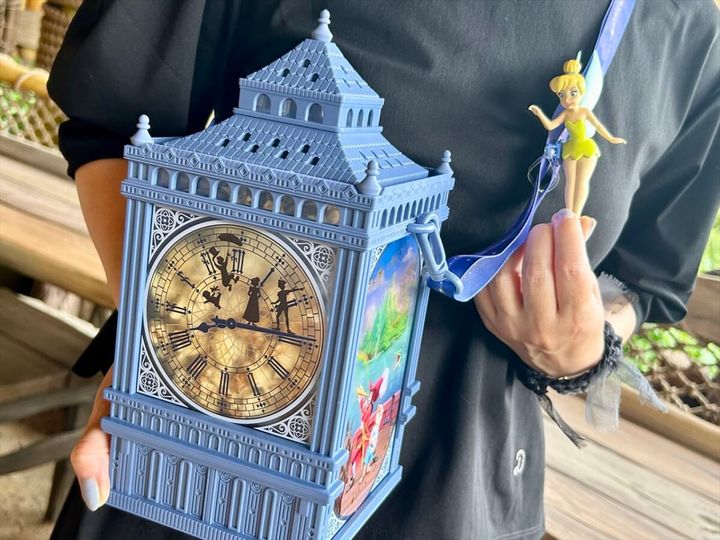 『ピーター・パン』の映画に登場する夜の時計台をモチーフにしたポップコーンバケットもとても素敵。ストラップには、ティンカーベルがついています。