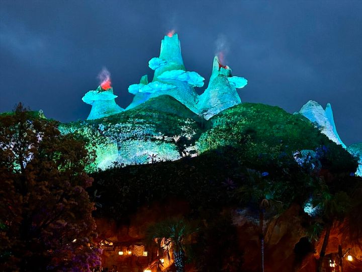 夜になり暗くなると、昼間の印象とはまた違った景色を楽しめます。ネバーランドの象徴的な山は、頂上が赤く光り、もくもくと煙が出ていました。